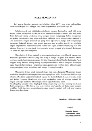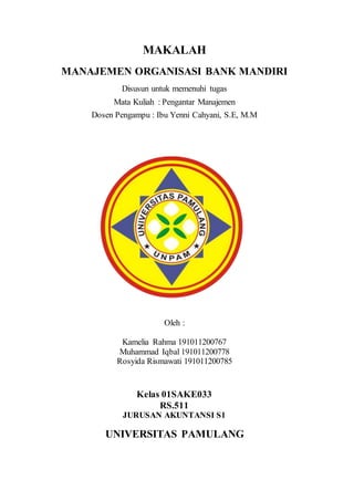 Makalah ini membahas manajemen organisasi Bank Mandiri, termasuk struktur organisasi, fungsi, dan tanggung jawab unit kerja dari tingkat pusat hingga cabang. Dengan latar belakang historis pendirian bank, dokumen ini bertujuan untuk memberikan pemahaman mendalam tentang manajemen di perusahaan BUMN tersebut. Selain itu, makalah ini ditulis untuk memenuhi tugas mata kuliah pengantar manajemen di Universitas Pamulang.