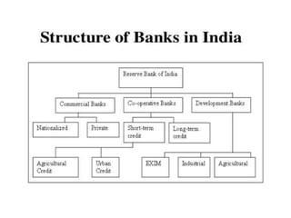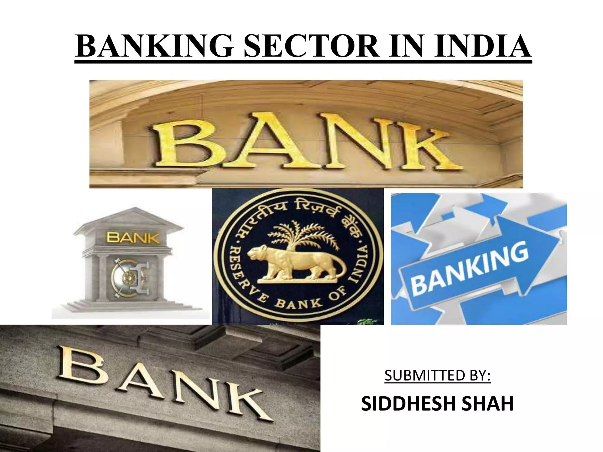 This document provides an overview of the banking sector in India. It discusses the definition of a bank according to Indian law and the history of banking in India in phases from the 18th century to present day. It also classifies the different types of banks in India including the Reserve Bank of India, public sector banks, private sector banks, cooperative banks, and development banks. The roles of commercial banks and investment banks are explained. Finally, it discusses modern modes of banking transactions such as e-banking, ATMs, debit cards, and credit cards.