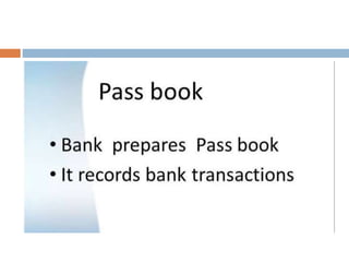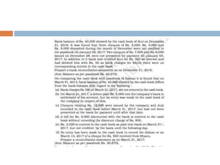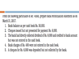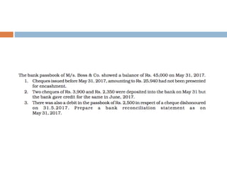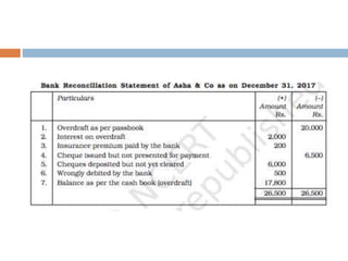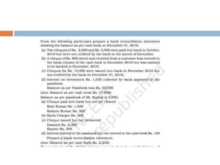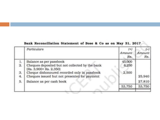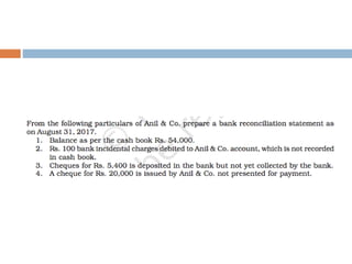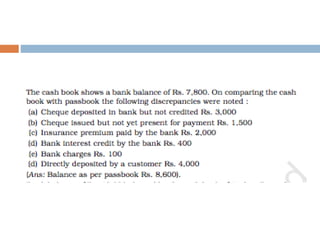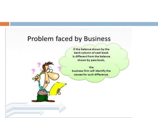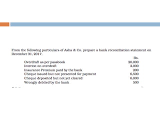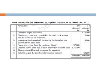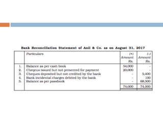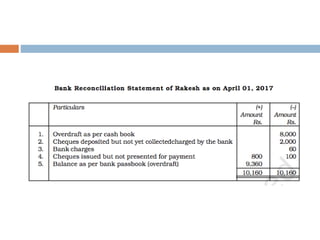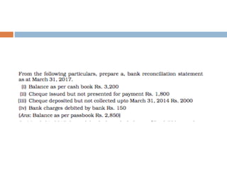The document outlines the concept and importance of bank reconciliation statements (BRS), detailing the various reasons for differences between cash book balances and bank passbook balances, including timing differences and errors. It highlights issues such as unpresented cheques, direct debits, and the impact of transactions not recorded in the firm's cash book. Additionally, it provides examples and formats for preparing BRS, illustrating how to reconcile balances through numerical examples.