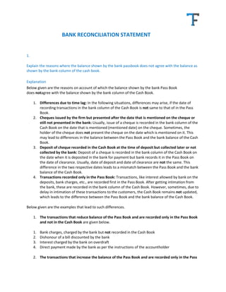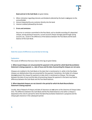 The document discusses reasons for differences between bank balances shown in a passbook versus a cash book. Key reasons include timing lags between transactions being recorded in each book, outstanding checks, and fees/interest only recorded in one book. It provides examples like interest charged by the bank only appearing in the passbook initially. The document also shows how to prepare a bank reconciliation statement to reconcile the two balances based on reconciling items like outstanding checks and deposits.