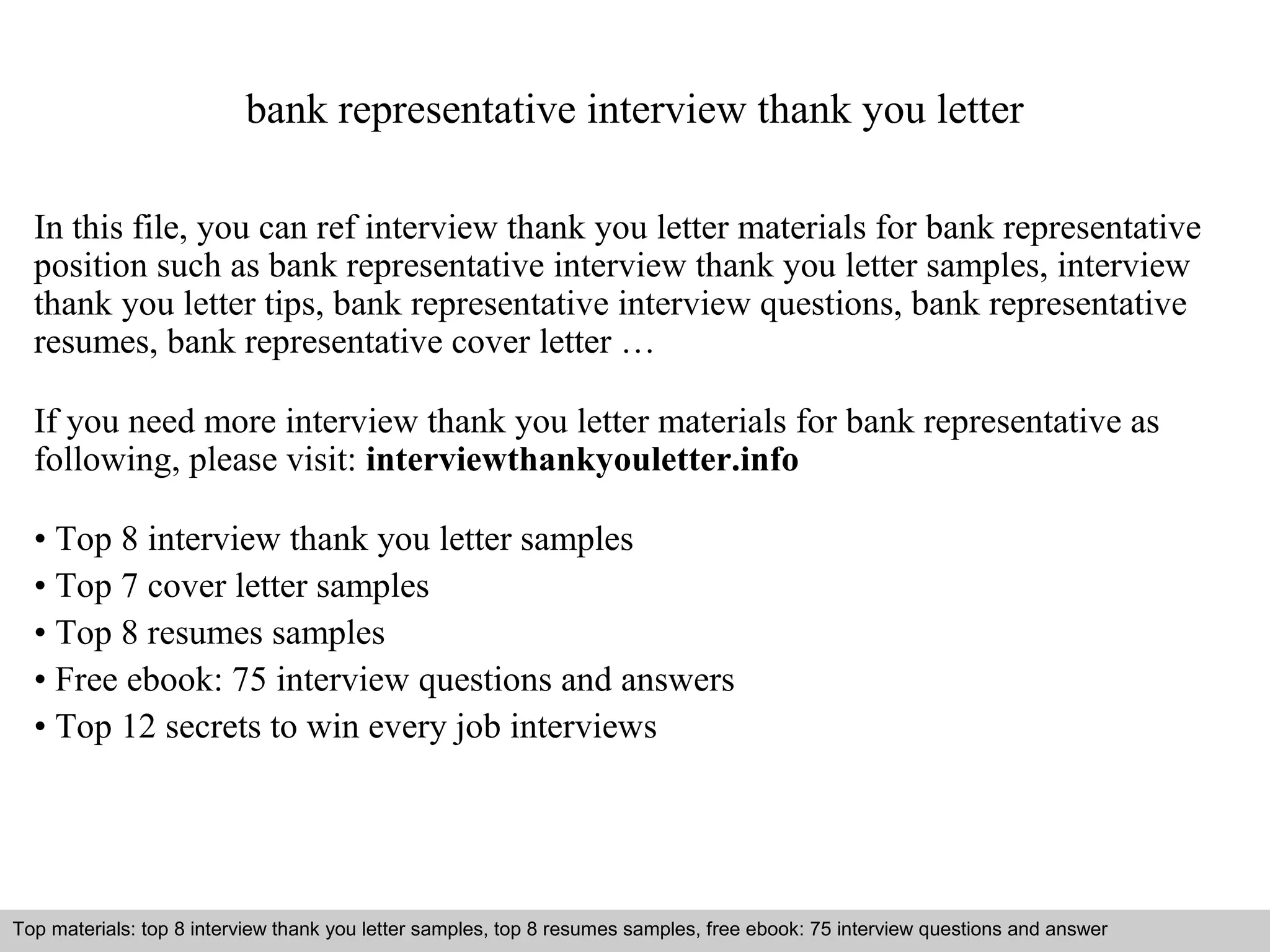 The document provides resources and templates for writing thank you letters after interviews for bank representative positions. It emphasizes the importance of following up quickly, personalizing letters for interviewers, and reiterating interest in the job. Additional resources include samples of thank you letters, cover letters, resumes, and interview questions and answers.