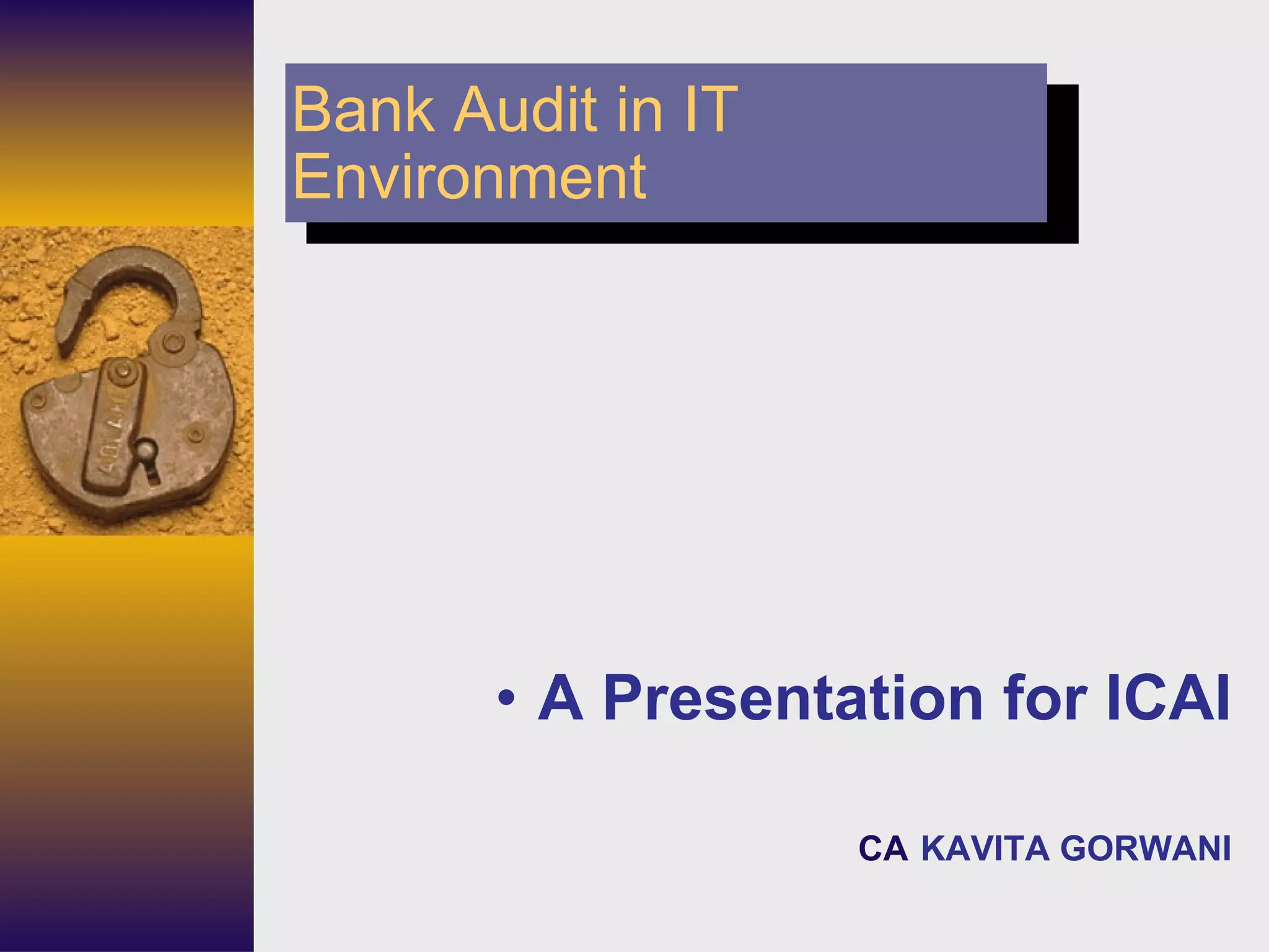 The document discusses the changes in the bank audit environment due to the widespread adoption of information technology. Key aspects that auditors must now consider include evaluating IT security controls, assessing the impact of IT systems on internal controls and the audit process, and using computer-assisted audit techniques. Auditors must upgrade their skills to understand IT systems and appraise the associated risks in order to effectively discharge their duties in the new IT-enabled audit environment.