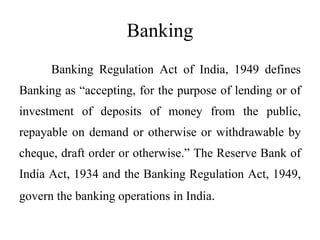 This document provides an overview of the banking system in India. It defines banking and outlines the key laws and institutions that govern banking operations, including the Reserve Bank of India Act and the Banking Regulation Act. It describes the structure of banks in India, categorizing them as commercial banks, cooperative banks, and development banks. It provides details on the various types of commercial banks, cooperative banks, and development banks in India. It also summarizes the major functions and roles of the Reserve Bank of India in regulating the banking system.