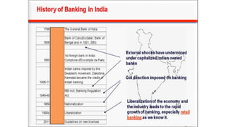 The document provides an overview of the Indian banking system. It discusses the key constituents including the Reserve Bank of India, State Bank of India and its associates, commercial banks, regional rural banks, cooperative banks, development banks like IDBI and NHB. It also covers banking terms, current statistics on key rates, portfolio management, and the role of banks in economic development through functions like mobilizing savings and providing credit.