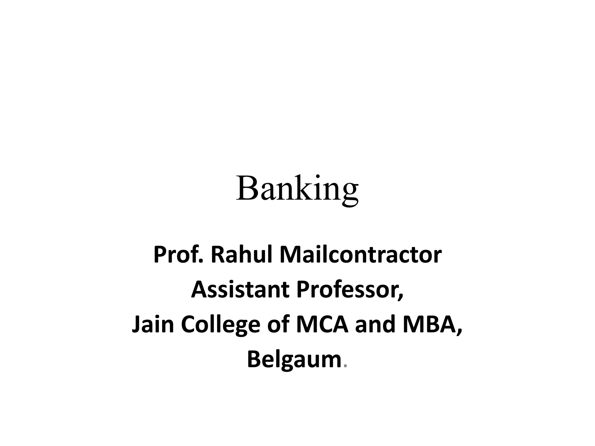 The document provides an overview of the banking system in India. It defines banking and outlines the key laws governing banking operations. It then describes the structure of banks in India, categorizing them as commercial banks, cooperative banks, development banks, and others. The roles of the Reserve Bank of India as the central bank and regulator are also summarized. Finally, common banking products, services, and lending activities are briefly outlined.