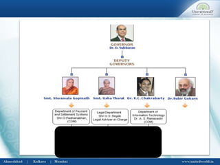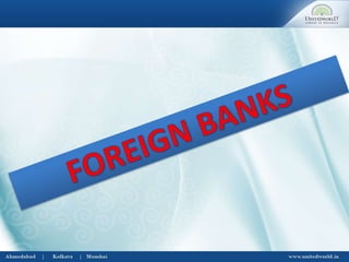 The document provides information about banks in India. It discusses the Reserve Bank of India (RBI), which was established in 1935 according to the RBI Act of 1934. The RBI formulates monetary policy and regulates other banks. It also discusses the objectives and functions of RBI, which include maintaining currency value and promoting economic growth. The document then covers commercial banks, their definition and functions, as well as nationalized commercial banks. It further discusses foreign banks operating in India, cooperative banks, scheduled banks and their classification.
