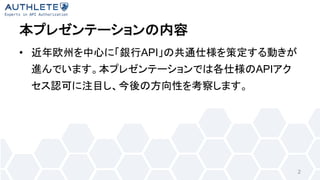 The document discusses various approaches to open banking APIs and strong customer authentication. It summarizes the OAuth flows and API specifications used in the UK Open Banking framework as well as approaches taken by the Berlin Group, Polish Banking Association, and a French bank. It also compares embedded and decoupled flows for customer authentication.