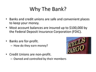 Banks are for-profit institutions that earn money through services like savings accounts and loans, while credit unions are non-profit cooperatives owned by members. Savings accounts provide interest income and have an annual percentage rate typically around 1-2%. Compound interest is better than simple interest since it earns interest on both the principal and accumulated interest over time. Certificates of deposit offer higher interest rates than savings accounts but may charge penalties for early withdrawals. Checking accounts allow purchases, payments and cash withdrawals, while overdraft protection can cover purchases made with insufficient funds for a fee. Proper check writing and endorsement procedures help prevent fraud. Maintaining an accurate check register is important for tracking account balances and transactions.