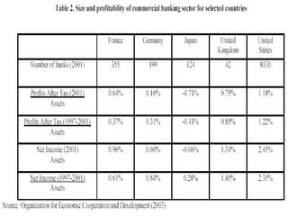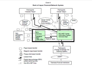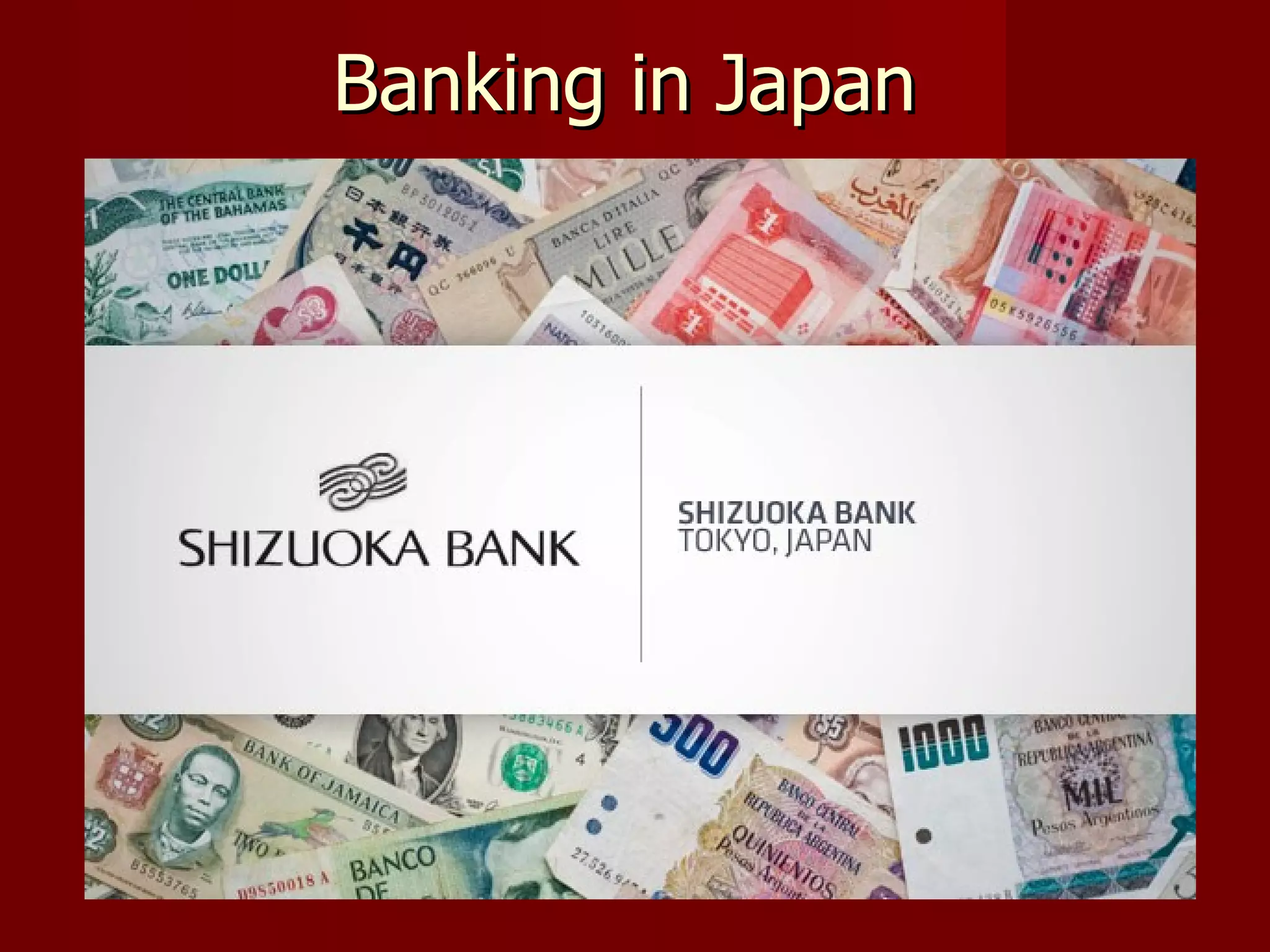 This document provides an overview of the Japanese banking system. It discusses the main features of Japanese banking including the main bank system where companies are closely associated with banks through long-term relationships. It also discusses the banking crisis in the late 1990s and early 2000s when non-performing loans became a major problem for Japanese banks. The regulatory system is also summarized, including the role of the Financial Services Agency as the primary banking regulator.