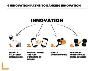 The document outlines 4 paths for banking innovation: 1) using big data and customer intelligence to better understand customer consumption patterns and behaviors to customize offerings, 2) fully utilizing the potential of mobile technologies like mobile payments, transfers, and wallets, 3) exploring equity crowdfunding to offer new investment options and improve startup access to capital, and 4) developing new tools to help micro and small businesses access markets, manage operations, and have their needs understood.