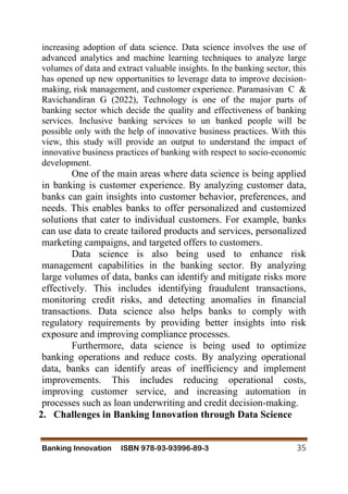The document discusses banking innovation through data science. It describes how data science has enabled banks to analyze large amounts of customer data to gain insights, develop customized products and services, improve risk management, and optimize operations. However, it also notes several challenges to banking innovation through data science, including ensuring data quality, protecting data privacy and security, developing specialized skillsets, overcoming legacy infrastructure issues, and complying with regulations.