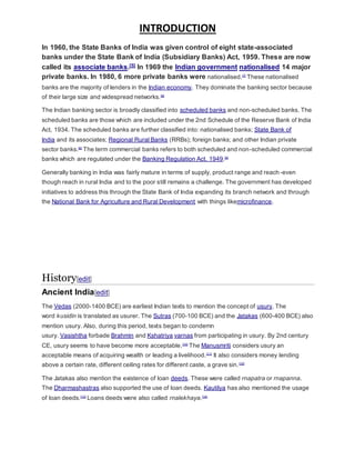 This document provides an overview of the history and development of banking in India. It discusses how banking originated in India in the late 18th century with the establishment of several banks. It then covers the development of banking during major historical periods in India including under British colonial rule, post-independence, and the current system. Key events discussed include the nationalization of major private banks in 1969, the establishment of state-run banks, and the Reserve Bank of India being established as the central banking authority. The document traces how the Indian banking sector has evolved from its early origins to the present day system.