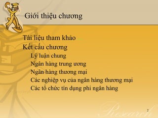 Chương III trình bày về ngân hàng và các nghiệp vụ ngân hàng, bao gồm sự ra đời, phát triển, vai trò của ngân hàng trung ương và thương mại. Ngân hàng thương mại thực hiện các nghiệp vụ huy động, cho vay và trung gian, trong khi các tổ chức tín dụng phi ngân hàng như công ty tài chính và quỹ tín dụng có chức năng hỗ trợ tài chính. Tài liệu cũng đề cập đến các thuật ngữ chính liên quan đến ngân hàng và quy định pháp lý trong lĩnh vực này.