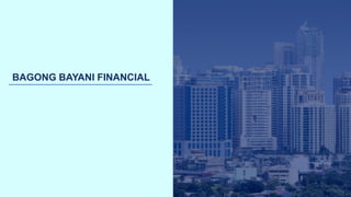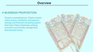 The document outlines a business proposition for 'Bagong Bayani Financial', aimed at creating a Filipino-centric online platform for money remittance, bill payments, savings, and financial consulting, targeting the over 2 million Filipinos working overseas. It addresses the financial management challenges faced by Overseas Filipino Workers (OFWs), offering educational tools and a secure means for money transfers, thereby promoting better savings and credit building. The business seeks $6 million in Series A funding to launch its operations and aims to pilot in six months, led by experienced professionals in finance and business management.