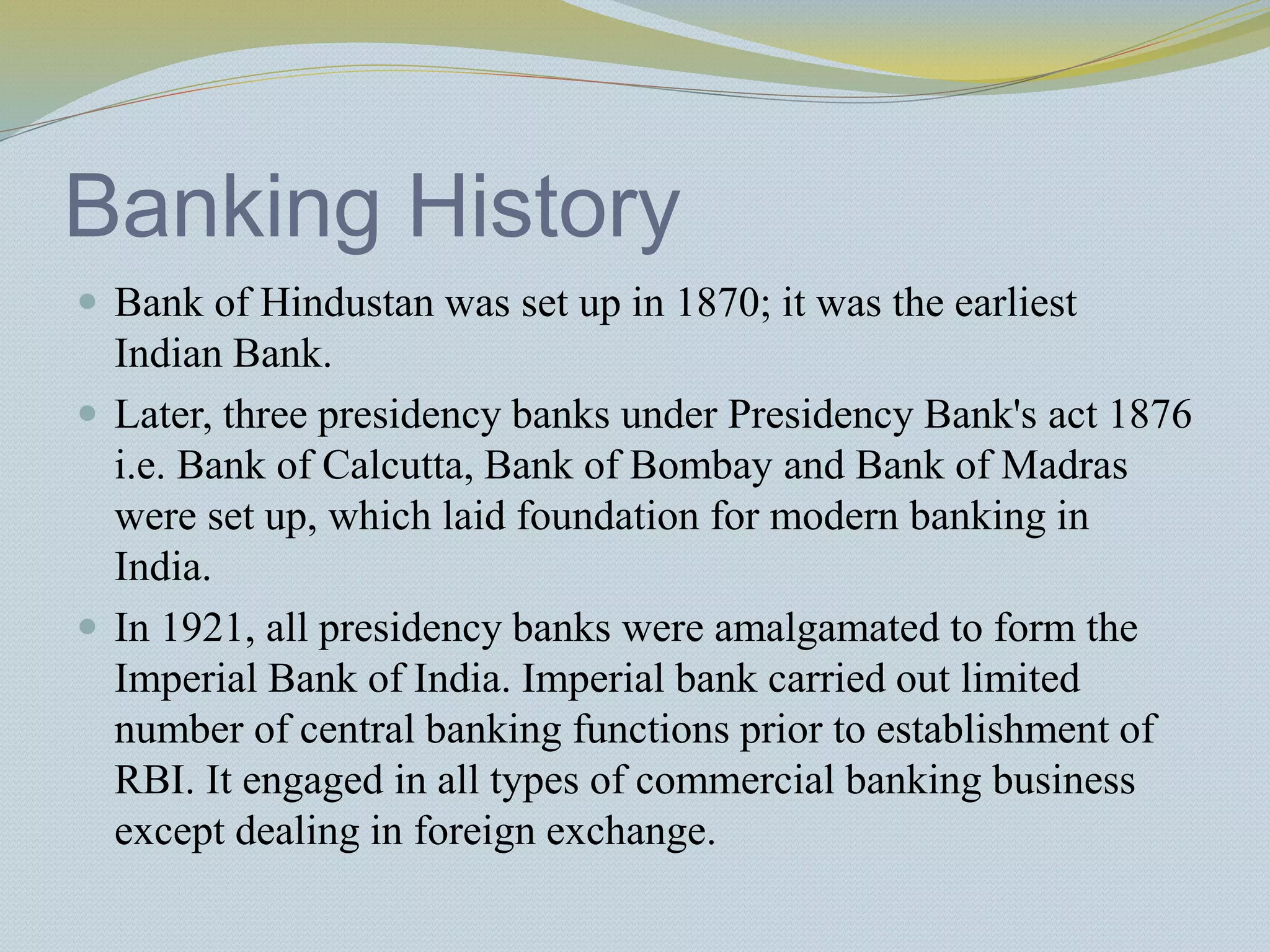 1) The establishment of early presidency banks in the 1870s which laid the foundations for modern banking. These were later amalgamated into the Imperial Bank of India in 1921.