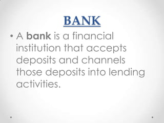 The document provides an overview of the banking industry in India. It discusses that banks accept deposits and channel those deposits into lending activities. It then outlines the major functions of banks which include accepting deposits, lending money, remittances, locker facilities, and foreign exchange business. The document notes that the first bank started in India in 1786 and discusses some key milestones in the development of the banking industry in India such as the nationalization of banks in 1969 and liberalization in 1991. It categorizes the banking industry into public sector banks, private sector banks, and cooperative sector and provides details about each. The document also discusses challenges faced by the banking industry such as deregulation and new rules, and future outlooks around risk management