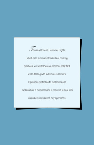 This document is a code of customer rights setting minimum standards for banking practices that a member bank agrees to follow in dealing with individual customers. It provides protections for customers and explains how the bank must handle day-to-day interactions. The code covers key commitments like the right to fair treatment, transparency, privacy, and grievance redressal. It also addresses information sharing, products and services, complaint resolution, collection of dues, and electronic banking.