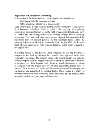 The document discusses various types of bank deposit accounts in India such as savings accounts, fixed deposits, and recurring deposit accounts. It provides details on the key features of each type of account, including minimum balance requirements, interest rates, withdrawal policies, and more. The document also examines how competition among banks for deposits is regulated in India to prevent unhealthy market practices and ensure stability in the banking system.