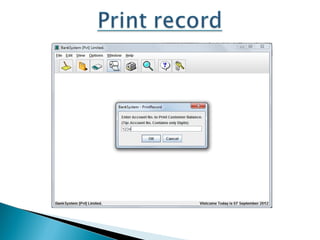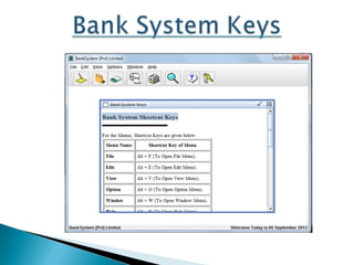 The document describes a banking system project designed by Prabhjot Saini. The system maintains lists of members and their accounts, allowing members to view up-to-date account information. It was developed using Java GUI on Windows XP with a text file backend for data storage. The system provides facilities like account access, inquiries, data storage, and reporting to help members and administrators manage bank operations more easily and reliably than manual methods.