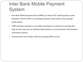 This document discusses various technologies used in banking. It describes Inter Bank Mobile Payment System (IMPS) and how it allows customers to transfer funds between banks via mobile devices. It also discusses online banking, use of analytics for segmentation and understanding customer preferences, convergence of storage and computing infrastructure, mobile banking, electronic bill payment, electronic fund transfer, electronic cheques, Real Time Gross Settlement (RTGS) system, and Automatic Teller Machines (ATMs). The benefits of these technologies for customers, banks and employees are reduced costs, immediate access to accounts and transactions, increased productivity and efficiency. The challenges are costs of implementation, risk of technology failures, penetrating rural areas and upgrading workforce skills.