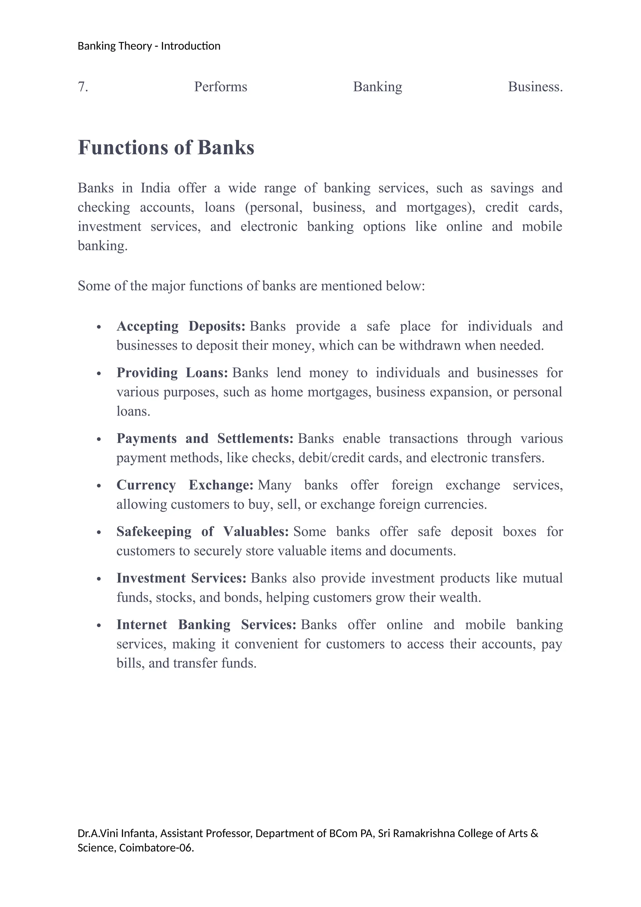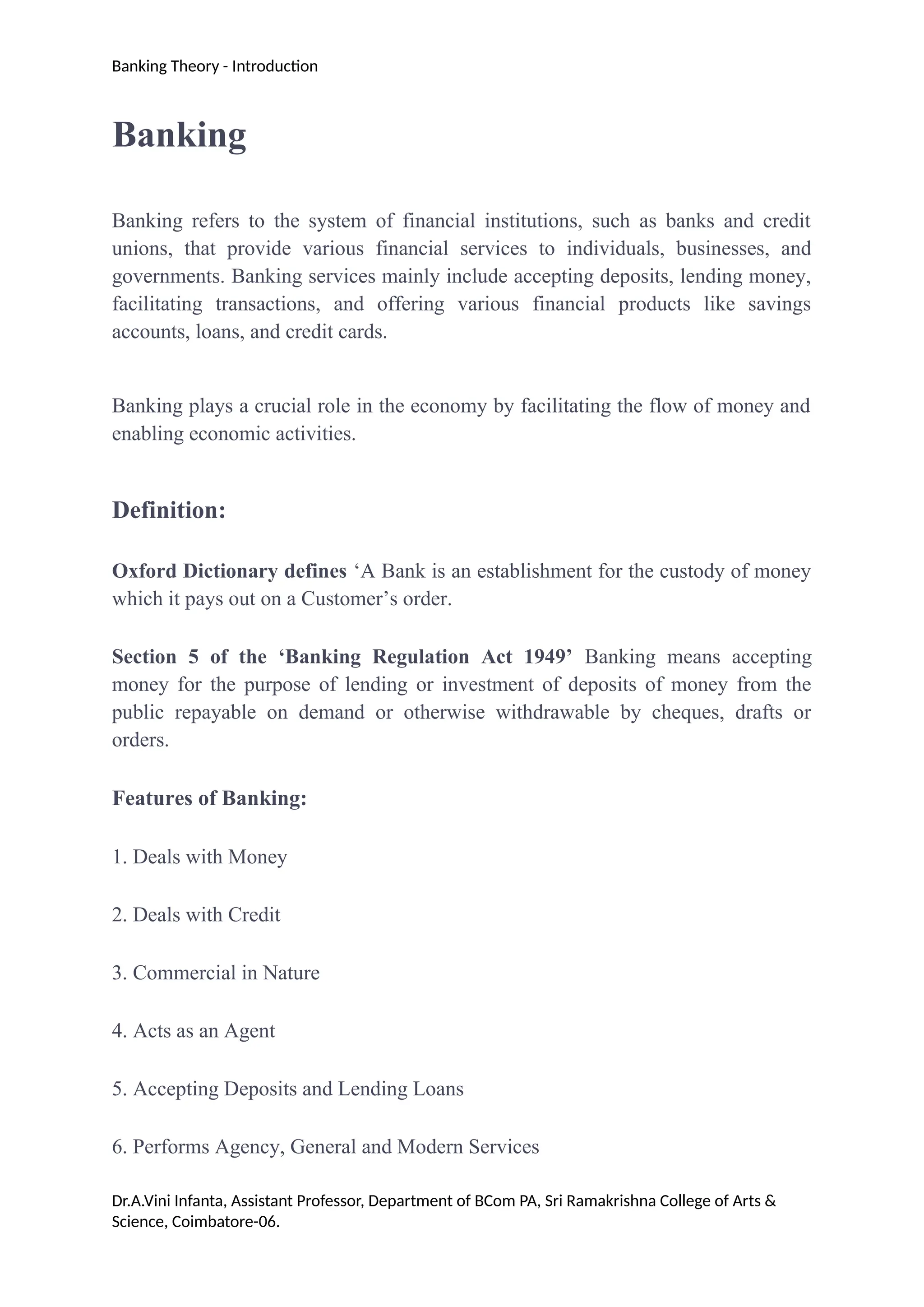 Banking refers to financial institutions providing services like deposit acceptance, loans, and transaction facilitation essential for economic activity. In India, banks are classified into types including central banks, commercial banks, cooperative banks, and payment banks, each with specific roles and services. The document discusses various banking functions, types of bank accounts, and the concept of credit creation within the banking system.