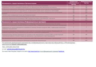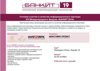 Документ приглашает организации стать информационными партнерами XVI Международного форума «Банкит’2019», предлагая доступ к новостям и комментариям от спикеров. Участники форума смогут насладиться насыщенной программой, мастер-классами и деловыми контактами. Предоставляются различные возможности и аккредитации для информационных партнеров, включая размещение материалов и участие в интервью.