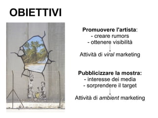 Il documento descrive un progetto di promozione per una mostra di Banksy a Roma, focalizzato su attività di guerrilla e viral marketing per creare attesa e coinvolgimento del pubblico. Include dettagli sulla comunicazione visiva attraverso graffiti di luce e manifesti, oltre alla pianificazione di un evento esclusivo per VIP e giornalisti. La mostra si terrà presso il MACRO Future, presentando opere e installazioni dell'artista, accompagnate da un corner shop dedicato.