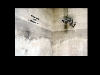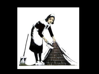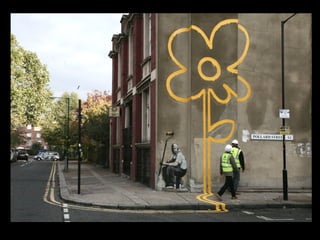 Banksy is a British artist born in 1974 in Bristol, England. He is known for his recognizable graffiti art found on walls, bridges, and trains from London to New York. Much of his work can be found on his website and he began using stencils as his medium, which allowed him to rapidly reproduce designs. Banksy's work is often political in nature and incorporates the environment.