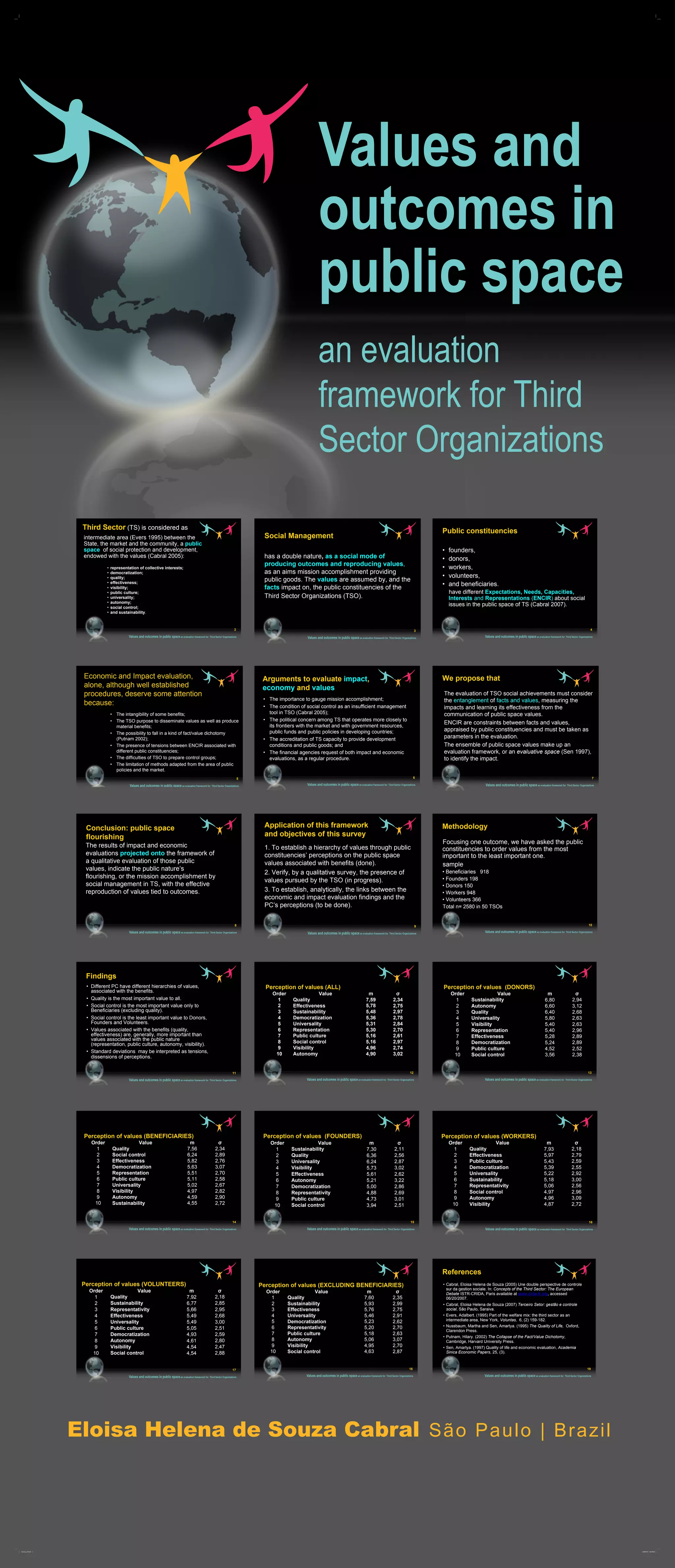 Evaluating Third Sector organizations requires considering both the impacts produced and how effectively values are communicated to constituencies. The values make up an evaluative framework to identify impact. This study aims to establish a hierarchy of values through public perceptions, verify the presence of important values through a qualitative survey, and analyze how economic/impact evaluations link to perceptions of different constituencies.