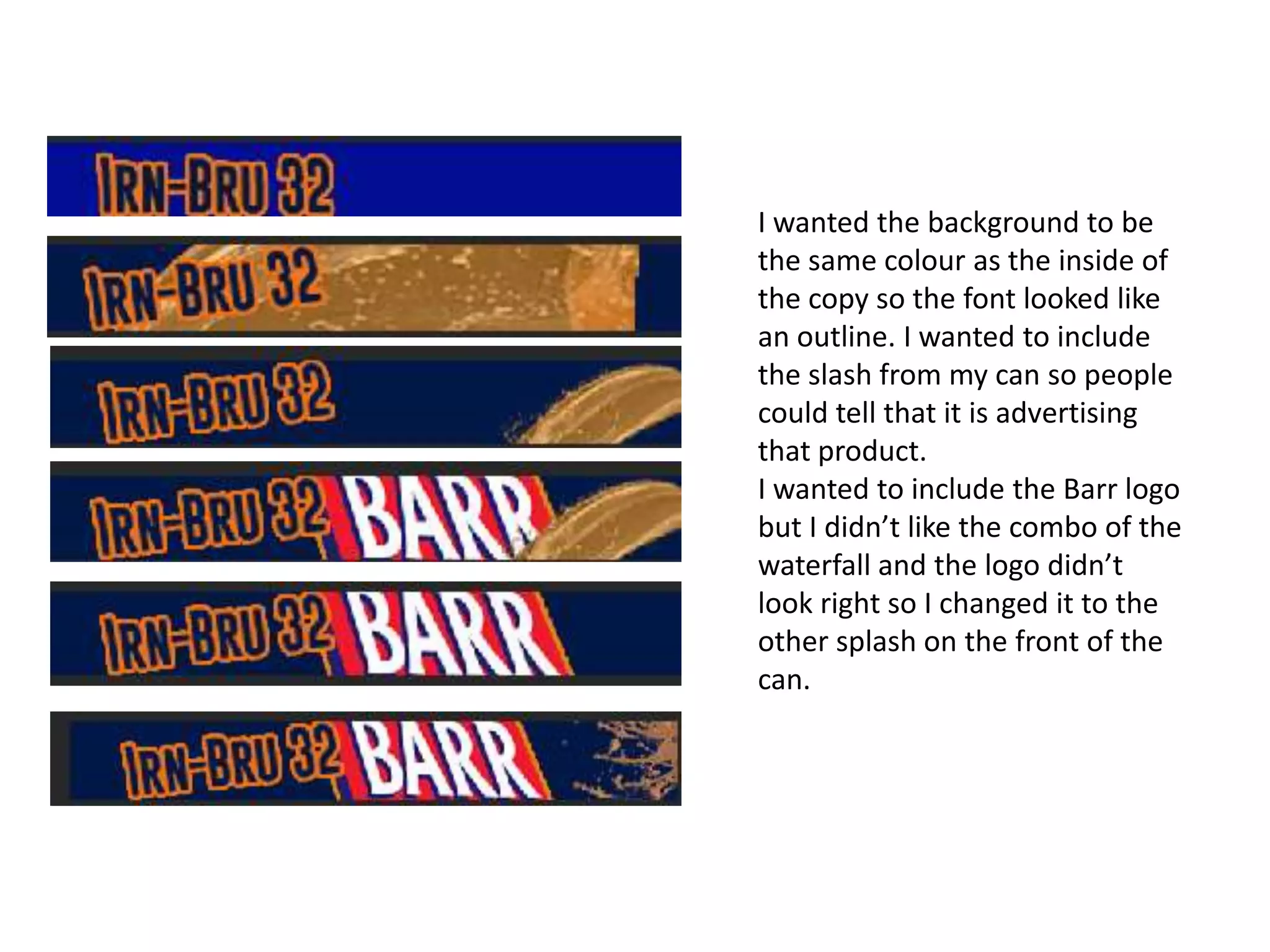 The document describes the process of creating several animated banners to advertise Irn-Bru soda. It discusses initial designs for a static banner that became animated by adding flashing text. It also describes creating a waving banner by editing a video into individual frames in Photoshop. Another rolling can banner aimed to reveal the copy on the can but proved difficult to animate fully. The final banner used a shrinking text effect within the Irn-Bru hyphen to reveal the can and copy.