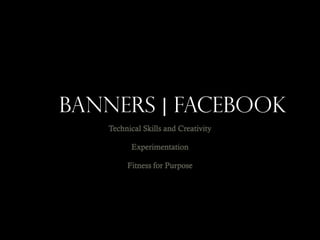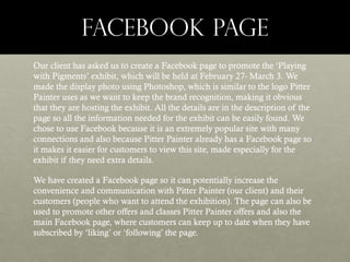 The document discusses the creation of banners for a Facebook page promoting an art exhibit for a client called Pitter Painter. Several banner design concepts are presented that experiment with textures, colors and layouts. The client wanted something that maintained brand recognition and an artistic, child-friendly style. After feedback, the final banner design features the client's font and logo against a light blue and orange color scheme to match their brand identity. This banner was approved by the client to be used on the Facebook page.