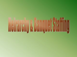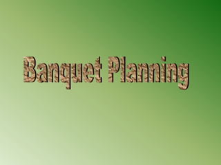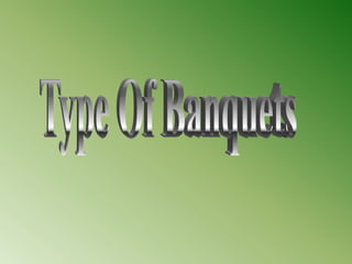 This document discusses banqueting and catering. It begins by defining a banquet and providing Indian terms. It then outlines the types of banquets as informal, semi-formal, and formal. It also discusses banqueting as an important revenue generating department. The document goes on to describe the types of banquet functions and provides details about banquet organization, staffing, menu planning, service styles, and sales. It concludes by outlining the principal types of banquets held in Chandigarh, India.