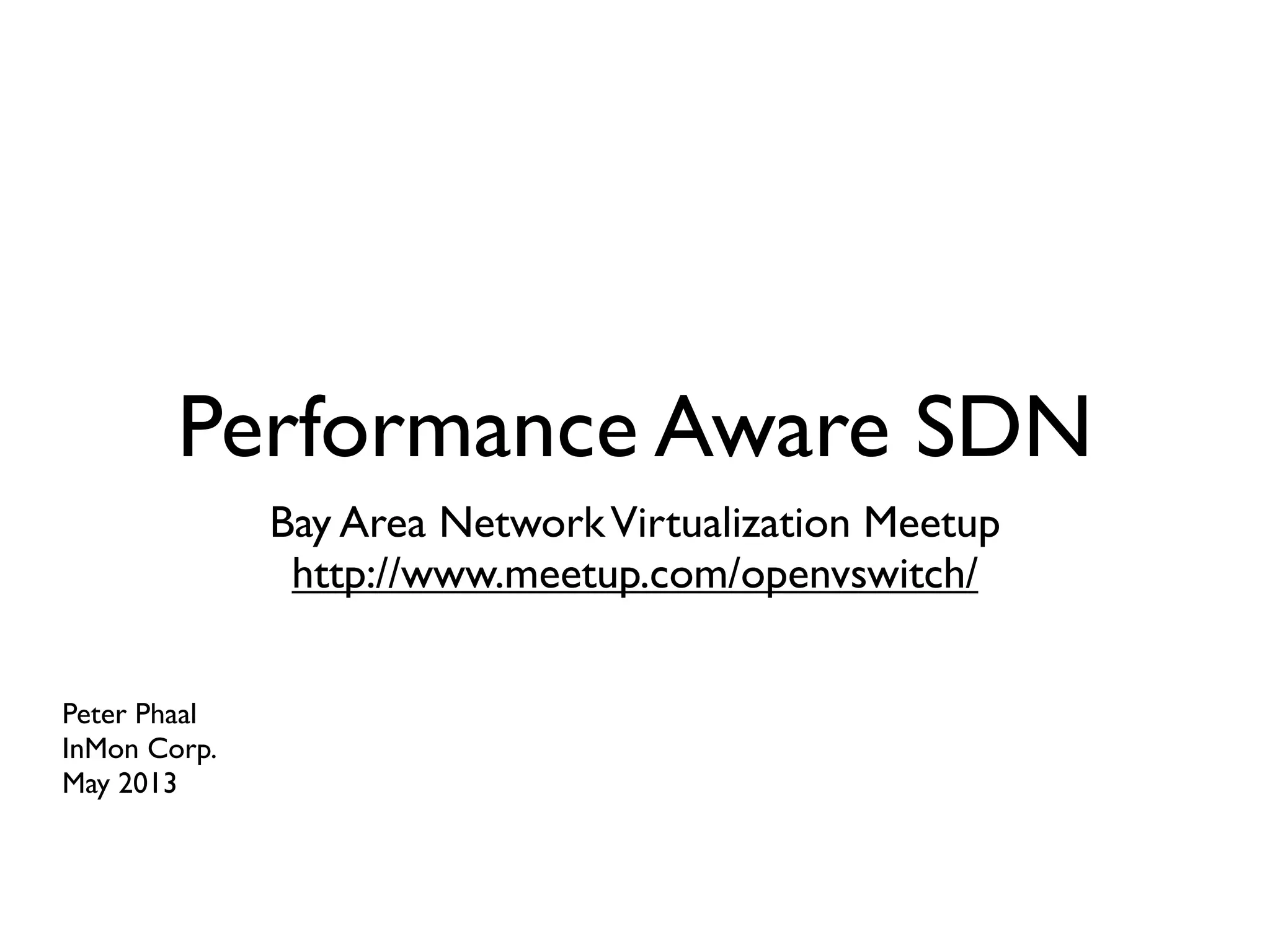 This document discusses performance aware software defined networking (SDN) using sFlow and OpenFlow. It describes how sFlow provides visibility into network performance by exporting packet samples and interface counters. When combined with OpenFlow's programmable control plane, sFlow and OpenFlow enable feedback control applications to monitor and control network performance in real-time. Examples given include using sFlow and OpenFlow for DDoS mitigation and load balancing large flows.