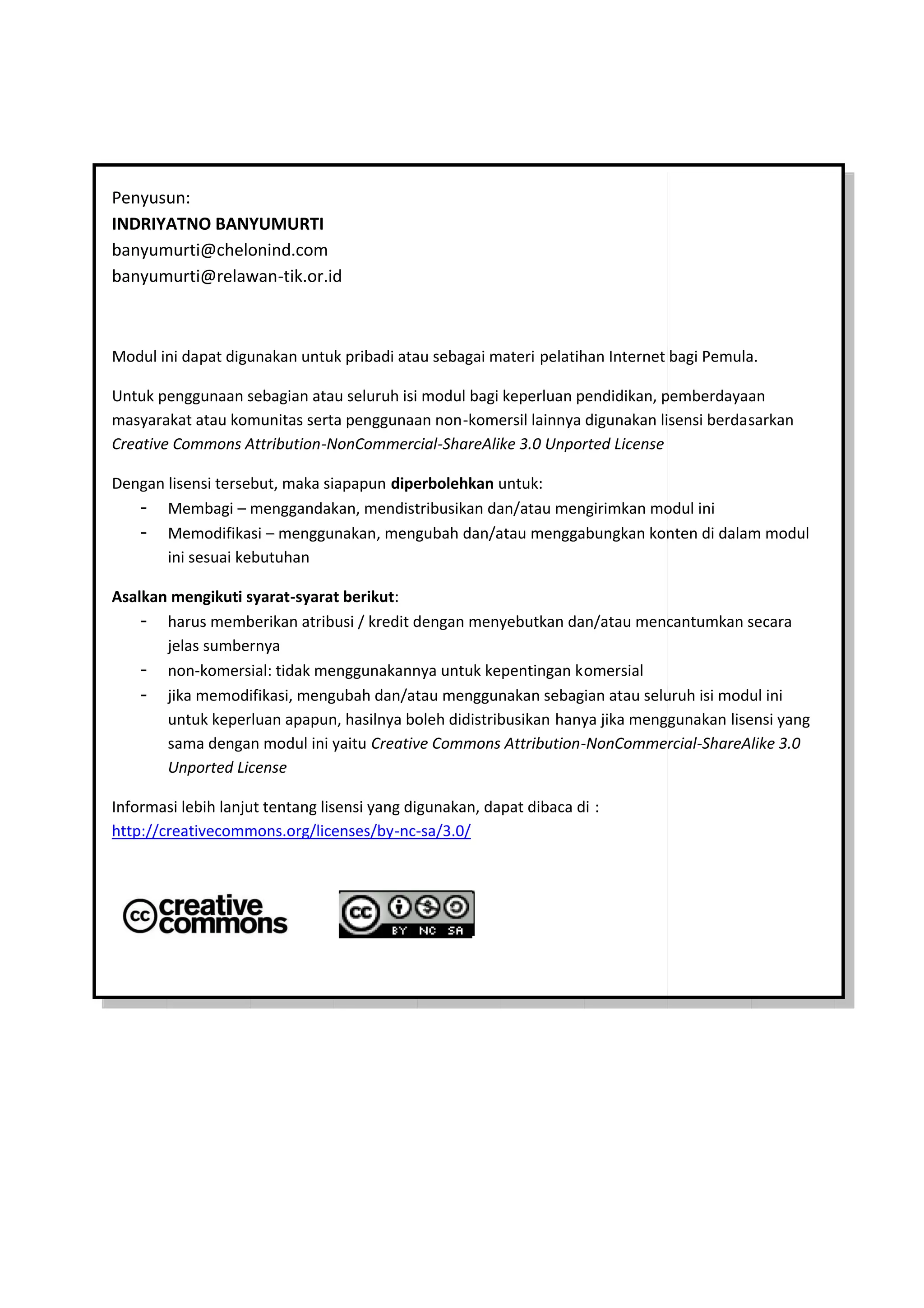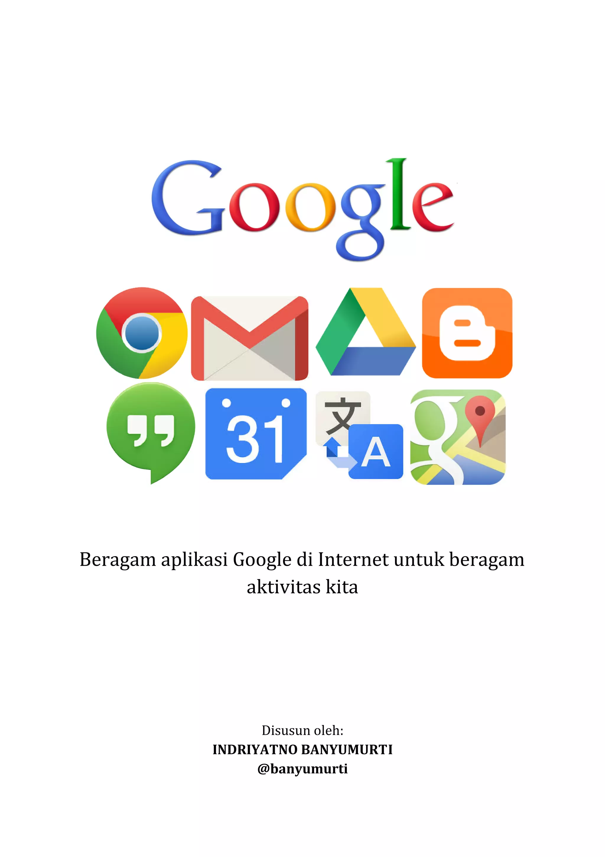 Dokumen ini adalah modul pelatihan internet yang disusun oleh Indriyatno Banyumurti, mencakup penggunaan berbagai aplikasi Google seperti Google Chrome, Gmail, Google Drive, dan lainnya, untuk kegiatan online sehari-hari. Modul ini bersifat non-komersial dan dilisensikan di bawah Creative Commons, memungkinkan penggunaan dan modifikasi selama atribusi yang sesuai diberikan. Terdapat petunjuk langkah demi langkah untuk membuka halaman web, menggunakan mesin pencari, dan mengelola email.