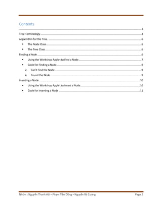 This document discusses algorithms for binary search trees. It begins by defining common tree terminology like root, child, leaf, and path. It then describes the Node and Tree classes needed to implement a binary search tree, with Node objects containing data and references to child nodes, and Tree containing a root Node. The document explains how to find a node by traversing the tree and comparing keys, and includes code for a find() method. It also covers inserting a new node using a similar approach.