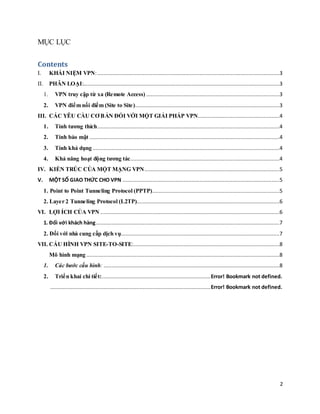 Tài liệu nghiên cứu về cơ chế routing của Cisco và mô phỏng VPN trên nền GNS3, bao gồm khái niệm, phân loại và lợi ích của VPN. Nó trình bày yêu cầu cơ bản cho một giải pháp VPN, kiến trúc mạng VPN, các giao thức như PPTP và L2TP, cùng với các bước cấu hình VPN site-to-site. Cuối cùng, tài liệu cũng nêu rõ lợi ích của VPN đối với khách hàng và nhà cung cấp dịch vụ.
