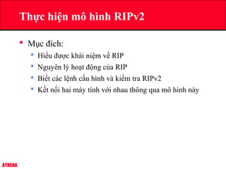 Tài liệu trình bày về mô hình định tuyến RIPV2 với mục đích hiểu khái niệm, nguyên lý hoạt động và lệnh cấu hình của giao thức này. RIP là giao thức định tuyến theo vector khoảng cách, sử dụng số hop làm chỉ tiêu và cập nhật định kỳ 30 giây. Tài liệu cung cấp các bước cụ thể để cấu hình và kiểm tra định tuyến RIPV2 trên thiết bị mạng.