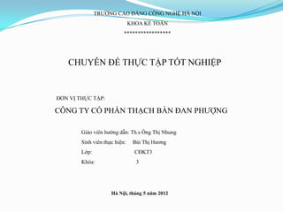 Tài liệu trình bày về thực tập tốt nghiệp của sinh viên Bùi Thị Hương tại Công ty Cổ phần Thạch Bàn Đan Phượng, tập trung vào hoàn thiện công tác kế toán chi phí sản xuất và tính giá thành sản phẩm. Công ty này đã được thành lập vào năm 2002, hoạt động trong lĩnh vực sản xuất và kinh doanh vật liệu xây dựng, và đang đối mặt với áp lực từ thị trường mở sau khi Việt Nam gia nhập WTO. Đề tài nghiên cứu mong muốn phân tích và cải thiện quy trình kế toán để đáp ứng các yêu cầu cạnh tranh trong bối cảnh lạm phát và gia tăng sự hiện diện của các công ty nước ngoài.