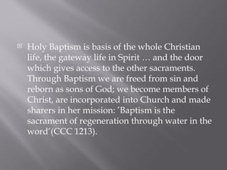 Holy Baptism is the basis of the Christian life and the gateway to other sacraments. Through Baptism, we are freed from sin, reborn as children of God, and made members of Christ and his Church. Baptism can be received by infants or adults; infants rely on God's grace and the decision of their parents, while adults publicly profess their acceptance of Christ. Baptism transforms us into God's people through receiving Christ's salvation, new life, and the promise of eternal life and forgiveness of original sin.
