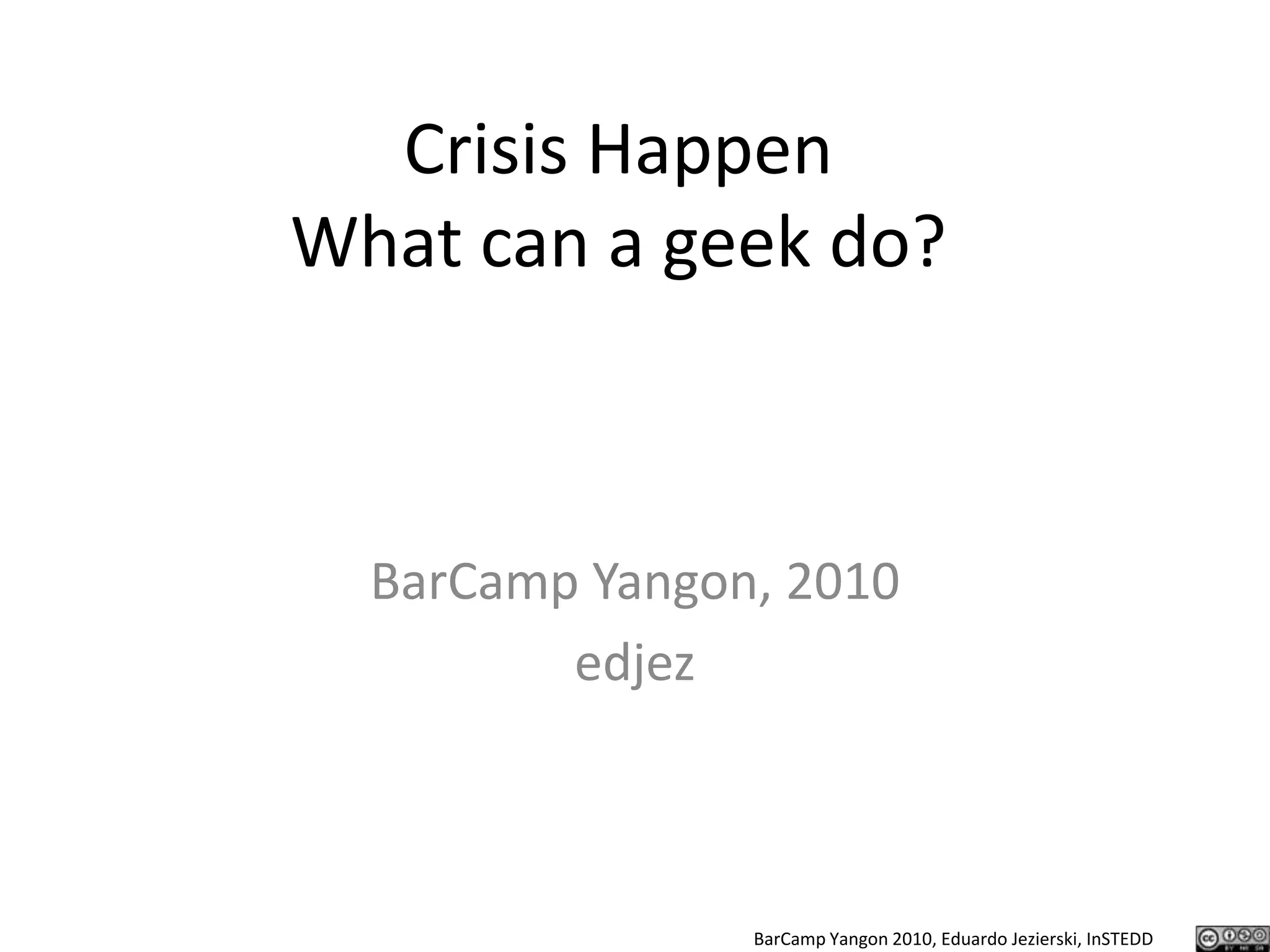 The document discusses the role of technology and communication in crisis situations, emphasizing the importance of local populations and institutions in providing relief. It highlights the need for effective collaboration, data collection, and the use of both structured and unstructured information to respond to crises. Additionally, it underscores the significance of building trust and community resilience before a crisis occurs, using examples from previous events like the Haiti earthquake.