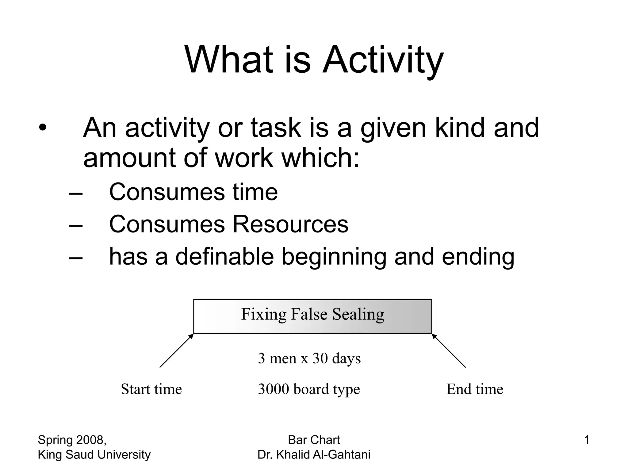 The document discusses activities, projects, and bar charts for project scheduling. An activity has a defined start and end time and uses resources. A project is a set of activities with defined objectives, completion date, and budget. A bar chart is a common project scheduling tool that displays activities as horizontal bars placed sequentially according to duration and dependencies. It can identify critical paths where delays could impact the overall project schedule.