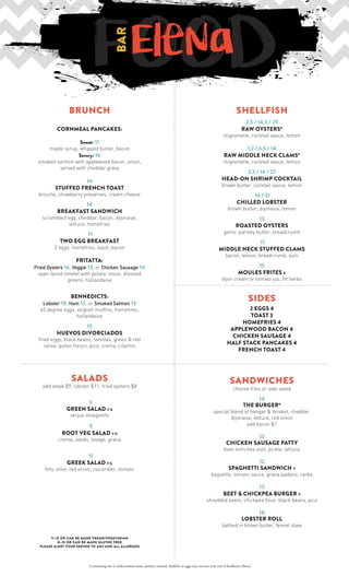 This document appears to be a menu listing various sandwich, salad, shellfish, and brunch options along with their prices. Some of the sandwich options listed include The Burger for $13, Chicken Sausage Patty for $12, and Spaghetti Sandwich for $13. Salad options include a Green Salad for $6 and Greek Salad for $9. Shellfish sections lists various raw oyster, clam, shrimp, and lobster options ranging in price from $1.20 to $29. The brunch section describes breakfast items such as pancakes from $11-16, stuffed French toast for $14, and egg dishes from $11-18.