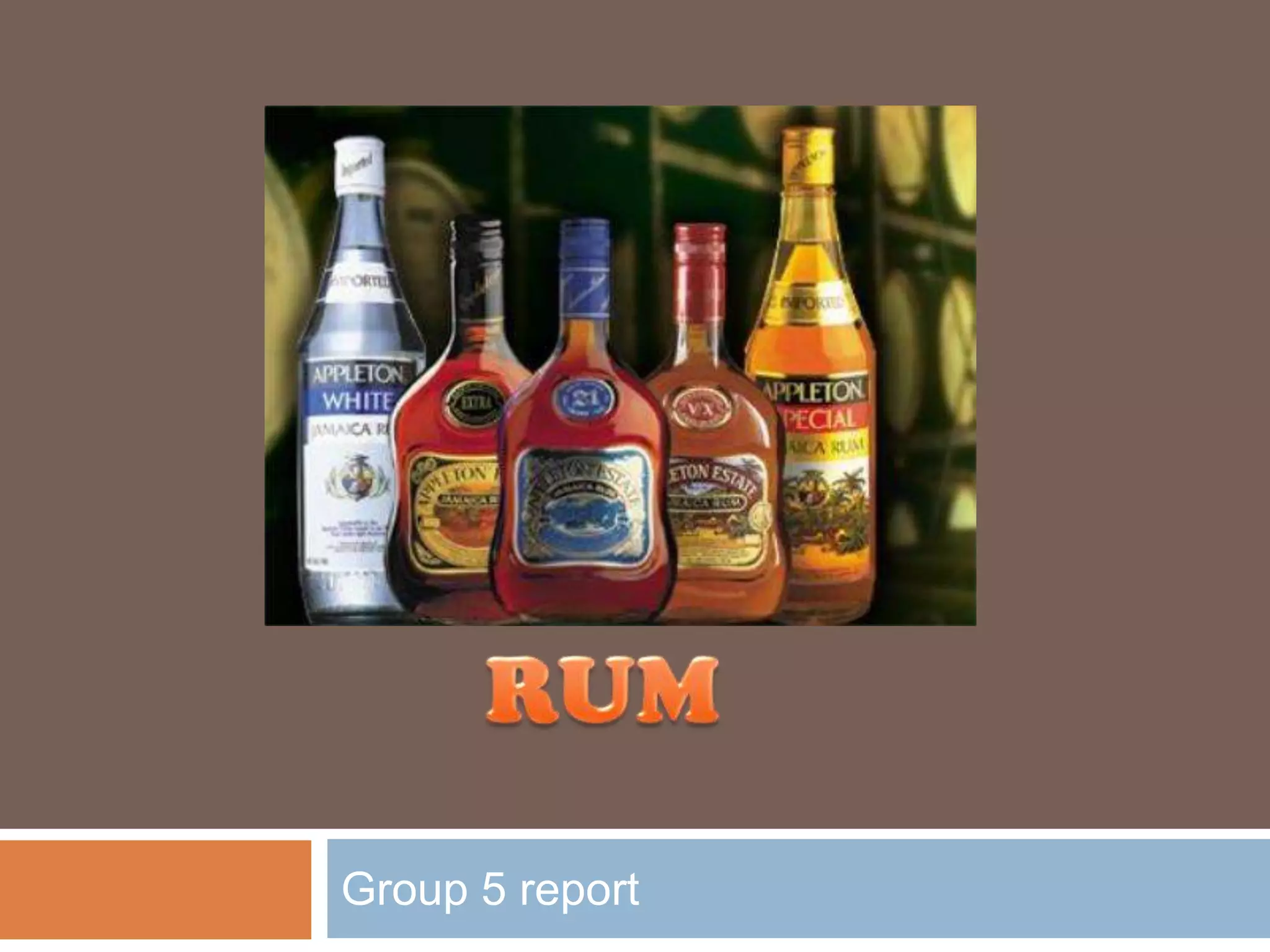 The document summarizes the history and production of rum. It discusses how rum originated from sugarcane juice or molasses in ancient India or China and was first distilled in the Caribbean in the 17th century. It then spread popularity to North America. The document also describes the various types of rum including light/white, spiced, aged, and aromatic varieties. It provides details on the rum production process and lists some popular rum brands.