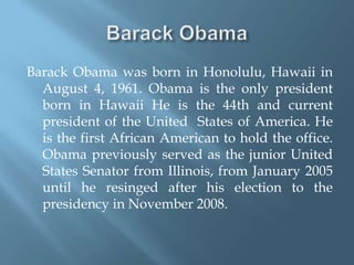 Barack Obama is the current President of the United States. He was born in Hawaii in 1961 and was the first African American president. Obama graduated from Columbia University and Harvard Law School, where he was president of the Harvard Law Review. He worked as a civil rights attorney and taught constitutional law at the University of Chicago. Obama served as a Senator from Illinois from 2005 to 2008 before being elected President. Some of his major accomplishments as President include economic recovery efforts, reducing troops levels in Iraq, and increasing troops levels in Afghanistan.