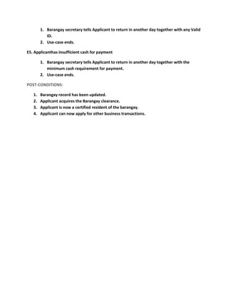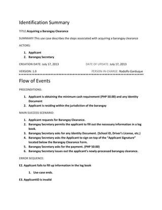 This document outlines the process for acquiring a barangay clearance in the Philippines. An applicant first requests the clearance from the barangay secretary and fills out a log book with their information. The secretary then verifies the applicant's identity, has them sign the form, collects payment of 50 PHP, and issues the newly processed clearance.