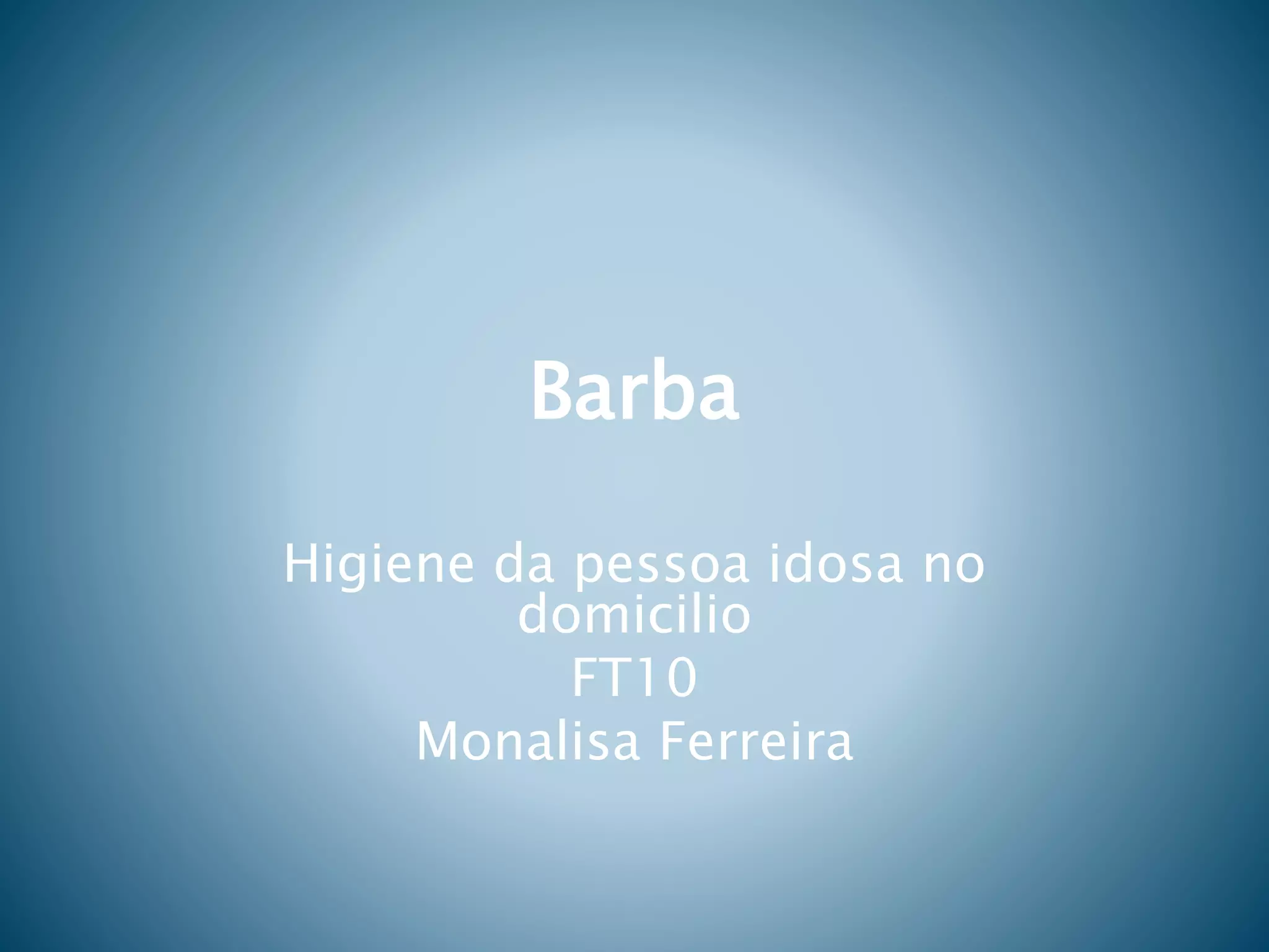 Este documento fornece instruções sobre como fazer a barba de uma pessoa idosa de forma segura e confortável. Deve-se preparar os materiais necessários, usar luvas, comunicar-se com o idoso durante o processo, amaciar a pele com água morna antes de aplicar a espuma, fazer movimentos leves com a lâmina, e hidratar a pele após a barba.