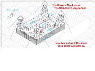 This document provides a detailed map and description of a Barbarian palisade or fort, including locations of towers, halls, pens, platforms, fences and other structures. It outlines defensive positions and patrol routes for Barbarians within and around the palisade. It also provides contingency plans and responses for different scenarios depending on whether the approaching party is detected by patrols or able to surprise them.