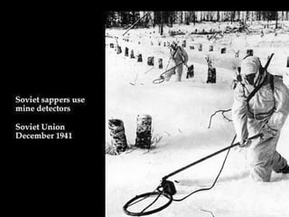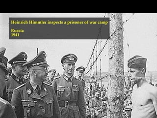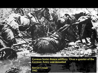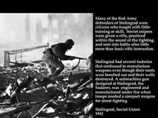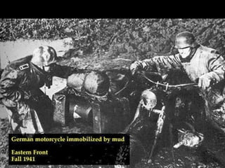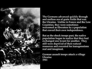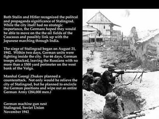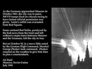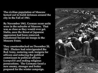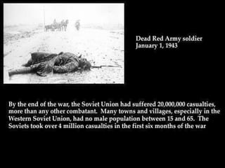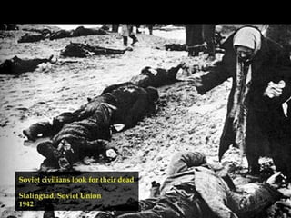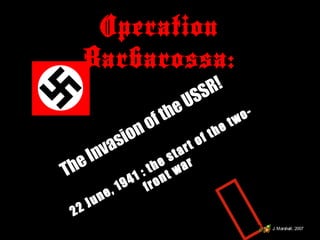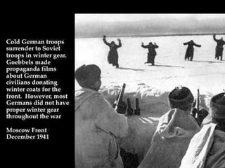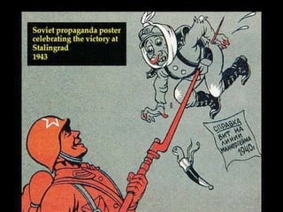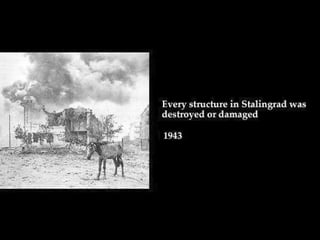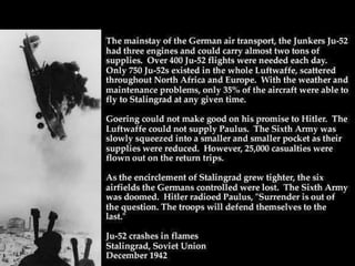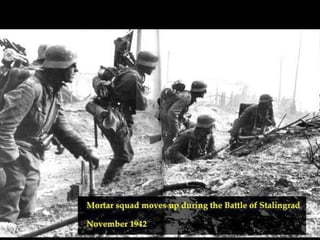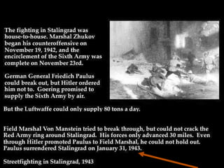 The document summarizes Operation Barbarossa, the German invasion of the Soviet Union on June 22, 1941. It describes how the invasion opened a two-front war for Germany and was initially successful, but stalled by December 1941, marking the end of Barbarossa. It then focuses on the key Battle of Stalingrad from August 1942 to January 1943, where German forces were encircled and defeated in their attempt to take the city, representing a major turning point in the war on the Eastern Front.