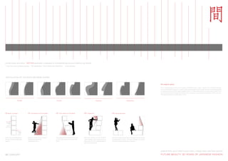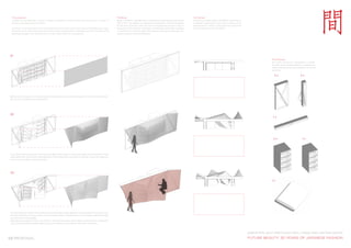 The document summarizes a proposed stage design for a fashion show. The stage design features a "body" structure made of timber frames and boxes, and a stretchy translucent "screen" made of latex or similar fabric. The structure and screen can be configured and reconfigured in various ways to interact with the choreography of the fashion show. During the show, performers will manipulate and move elements of the timber structure behind the screen, distorting the screen's shape and revealing the performers at times. The lighting design will enhance the presentation, starting with a flat white screen and progressing to reveal the structure and accentuate the performers' movements with spotlights during the climactic moments of the show.
