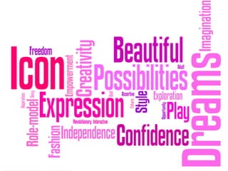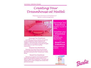 The document discusses the concept of a 'master idea' for the brand Barbie, emphasizing its role as a unique and influential symbol that shapes the purpose, culture, and values of the organization. It explores Barbie's history, the vision of her founder Ruth Handler, and how the brand has the potential to empower young girls by allowing them to imagine and create their own futures. Additionally, it highlights the importance of integrating the master idea into communication and marketing to position Barbie as a timeless icon in contemporary culture.